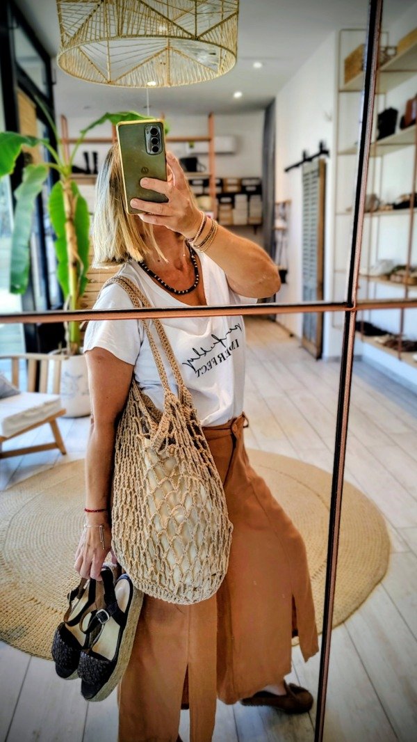 Bolso de Red trendy ideal para viaje acompaña todos los outfit de descanso y no ocupa lugar en la valija. Tejido artesanal a crochet . 100% hilo algodón
