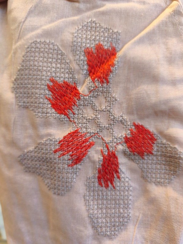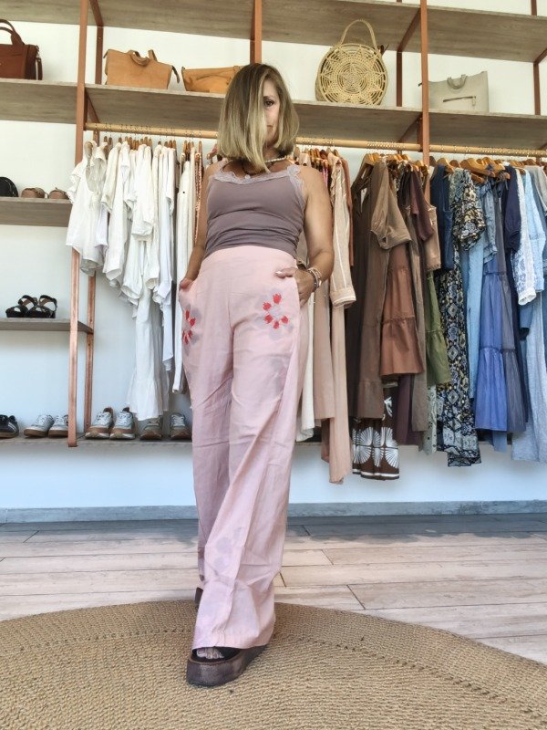 Pantalón rosa palo bordado flores cintura elástico en partes trasera.
